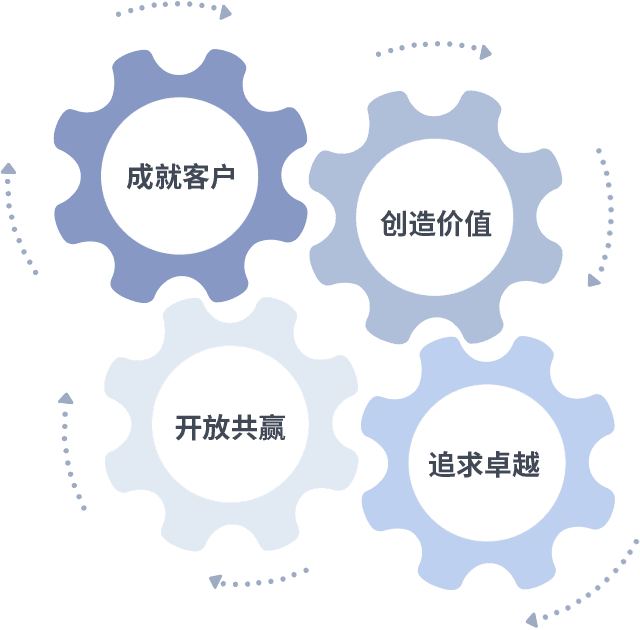 成就客户是一切决策的出发点,,创造价值是衡量所有工作的标准,,,,追求卓越是我们做事做人的态度,,,开放共赢是我们的格局也是最终的结果。。价值观的齿轮环环相扣,,,,推动着组织里的每个人不断向前。。