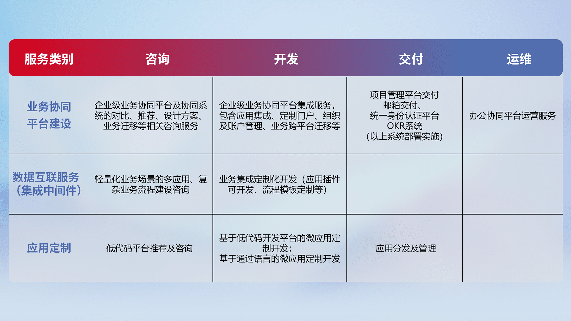 针对钉钉、、、、企微、、、、IDaas等平台级产品提供产品的规划、、方案、、交付、、、定制化开发等服务,,,实现如统一协同办公、、、、智能客户服务、、、混合会议管理、、、智能数据查询、、等业务场景,,,,实现数字化转型。。。。